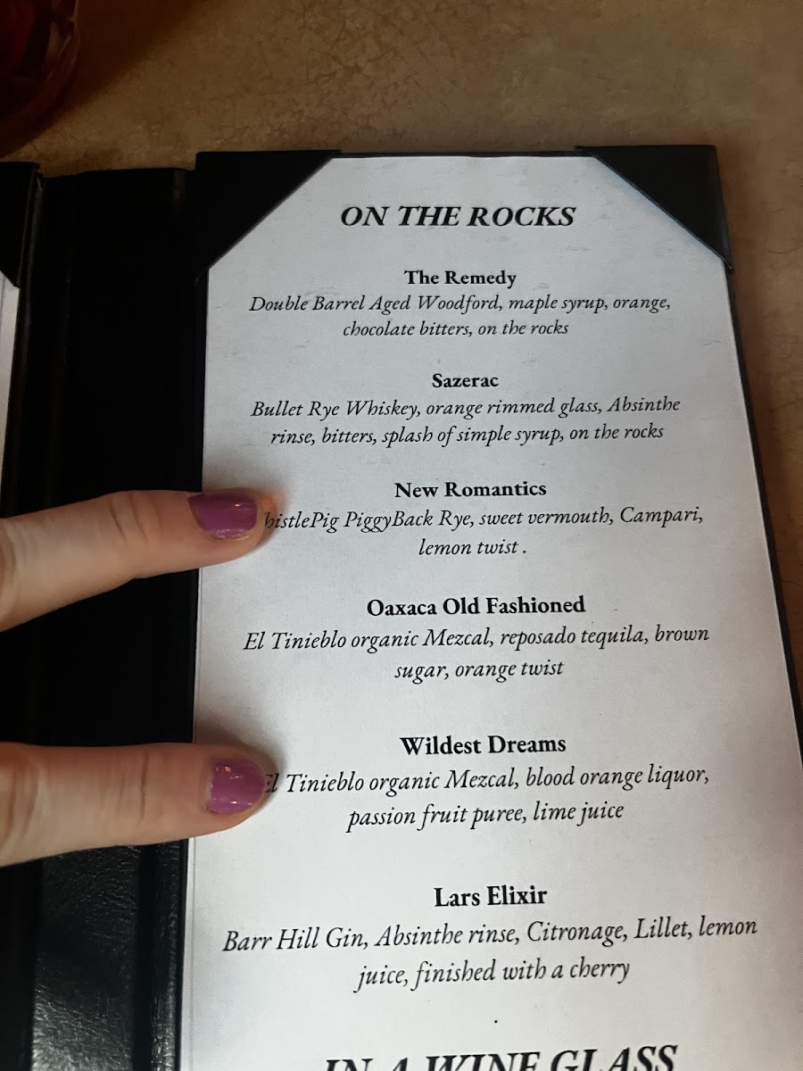 Bulleit rye whiskey, orange rimmed glass, absinthe rinse, bitters, splash of simple syrup, served on the rocks with orange.